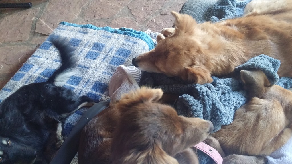 The first thing I did was try to figure out how to keep them warm. We have a large lovely back verandah but in winter we’re exposed to very cold winds and storms do bring horizontal rain. Suddenly a huge hole was cut in the door to the outside laundry making a “doggy door” and fence posts moved to make the laundry part of the back yard. A heat mat and baby mattress were placed inside the laundry and all looked snug.